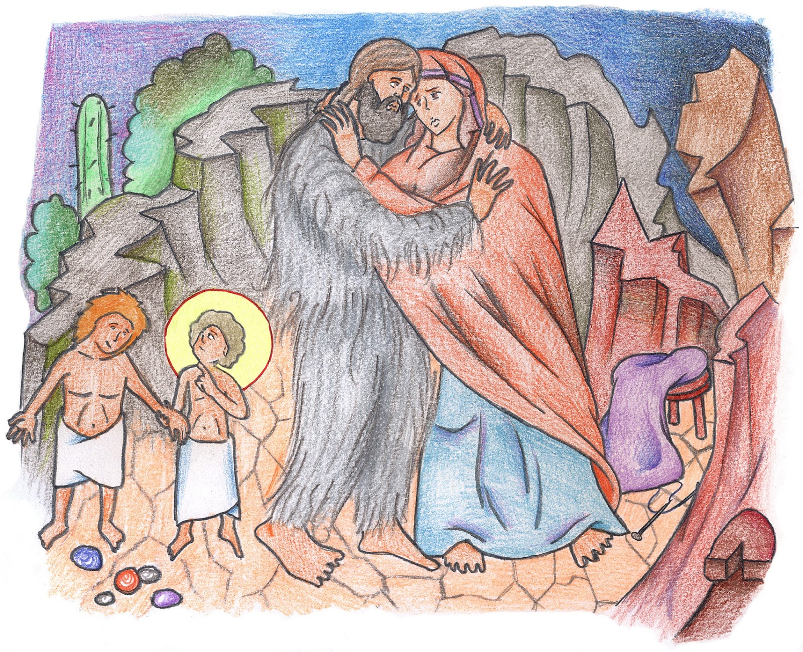 1. Иза тога Адам позна Јеву жену своју, а она затрудне и роди Кајина, и рече: Добих човека од Господа. 2. И роди опет брата његовог Авеља.
